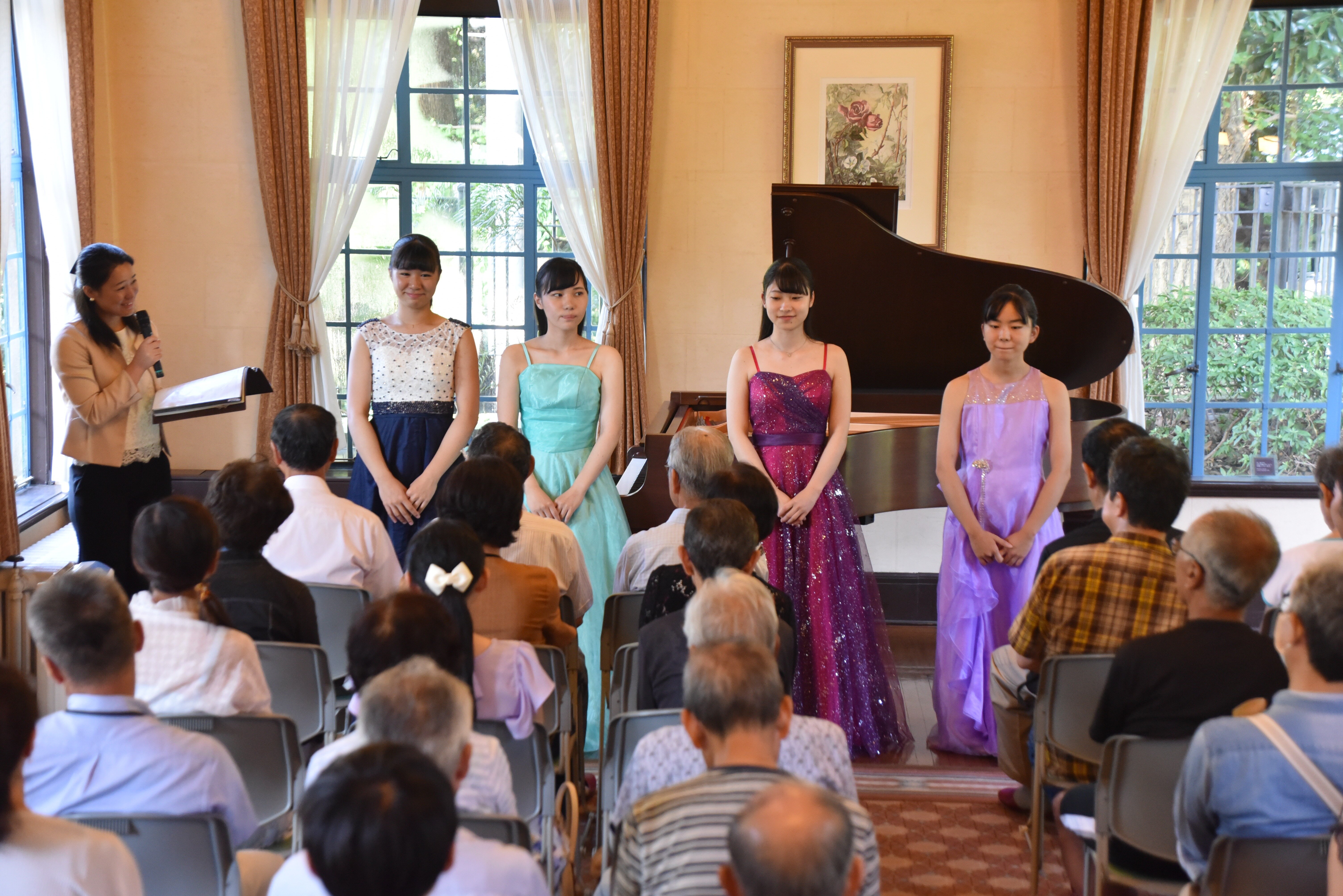 3日にベーリック・ホールでのサロンコンサートを行いユースピアノ部門の入賞者・特選受賞者4人(森田夏華さん、美里芽玖さん、清水楓花さん、森永冬香さん)に演奏していただきました。酷暑の中、会場には大勢の方にお越しいただきありがとうございました。「かなコン」でお馴染みの方にもいらしていただき、私も楽しくお話しさせていただきました。洋館の雰囲気にぴったりの魅力をお持ちの出演者でしたので、とても華やかな夏のひとときとなりました。