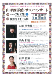 コンサート関連では上記の「山手芸術祭」で2月22日(土)14時からイギリス館で第35回の入賞者3人(ユースピアノ部門・本田琳太郎さん、ヴァイオリン部門・杉山和駿さん、ピアノ部門・石津若葉さん)が出演します。入場無料ですので、お時間のある方はぜひ!