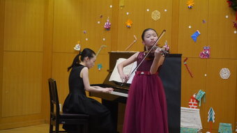 翌週の14日に初めて訪問した「白寿荘」ではヴァイオリン部門の小学校中学年の部本選進出者の井上佳音さんと山田佳歩さんにご登場いただきました。先週の美乃さんと併せて佳音さんと佳歩さんも赤いドレスでした。クリスマスカラー!なんでしょうか?3人ともとても華やかでしたよ。