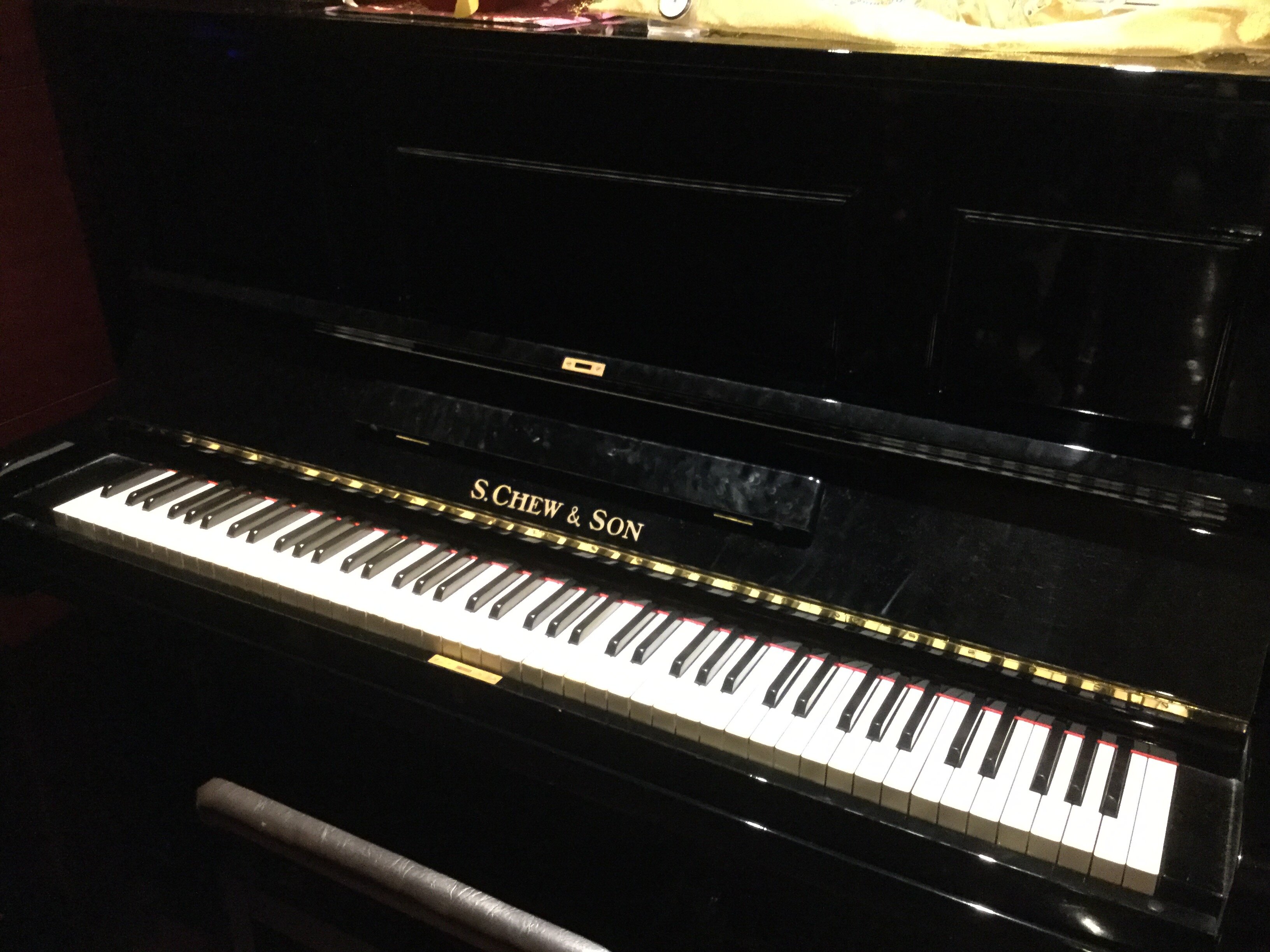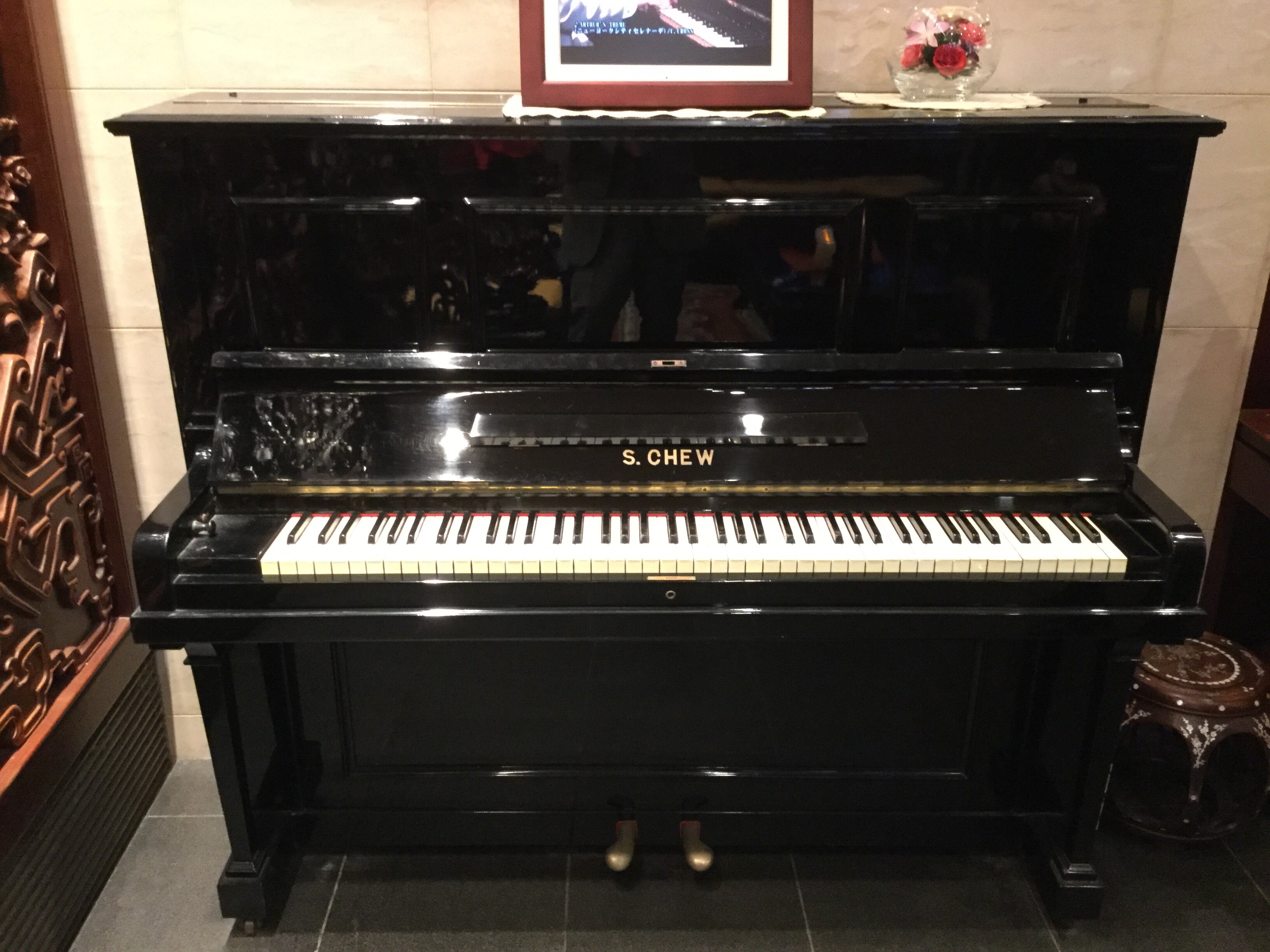 レストランのピアノは連日使用されている現役。こちらのサインは2代目の製作を表す「S.CHEW&SON」