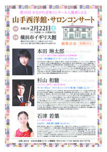 今回、3名の方が出演する山手芸術祭は、山手エリアで行う冬のイベントで今回が14回目になります。このエリアは横浜市が「景観風致保全地区」に制定し、近隣住民との共存をはかりながら景観の美しさを横浜の財産として保持しています。横浜を代表する観光スポットでありながら派手な装飾や飲食店・お土産物など観光客目当ての店舗などを極力抑え、古き良き物が現存する落ち着いた佇まいがする貴重な場所です。私もこの一帯が大好きで所属している職場の主旨(地域の活性化や地域文化の普及)と合致することもあって、サロンコンサートなどを通じて山手の素晴らしさを紹介しています。