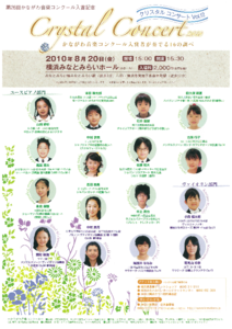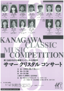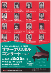 一足先に終了した「かなコン」はこの時期から入賞記念コンサートに突入します。夏休みの定番として20年以上続いているのが「クリスタルコンサート」です。ご支援をいただいた故・水利笑子(みずかが・えみこ)さんの「子どもたちに良い環境での演奏機会を提供したい」というご意志の元、これまでに大勢の人たちが出演されました。中には演奏家として活躍している人や「かなコン」の審査員になられている人もいらっしゃいます。